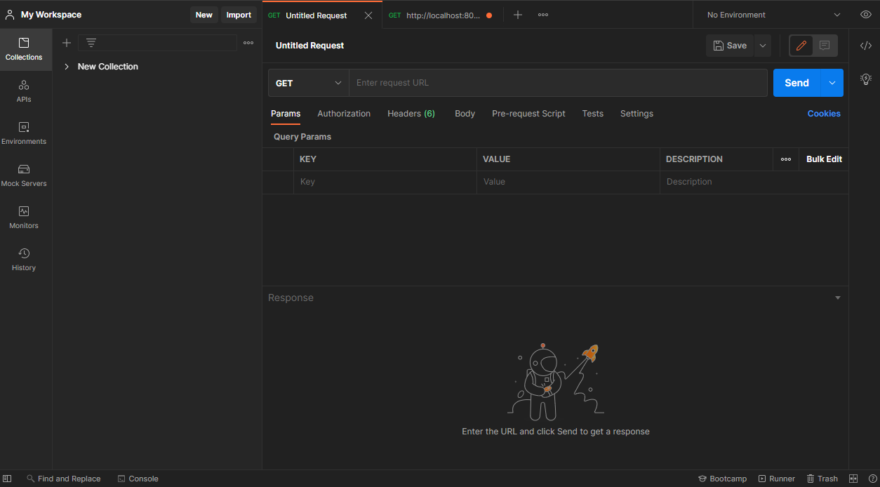 그럼 나의 workspace가 뜨면서 다음과 같은 창이 뜨는데, 해당 입력창에 api 주소를 복사해 넣고, HTTP 요청 방식을 설정해서 요청하면 관련 정보가 나오게 된다.