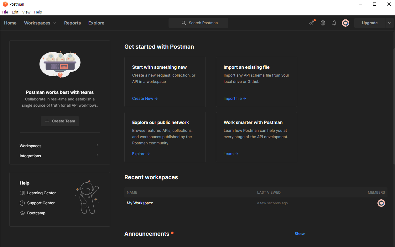 그 후 위의 링크를 통해 Postman app 버전을 다운받는다. Postman Web 버전 또한 존재하지만, 전반적으로 프로그램을 받아서 사용하는 것이 더 직관적이고 사용하기 편리하다는 의견이 많아 다운받아서 사용해 볼 것이다.