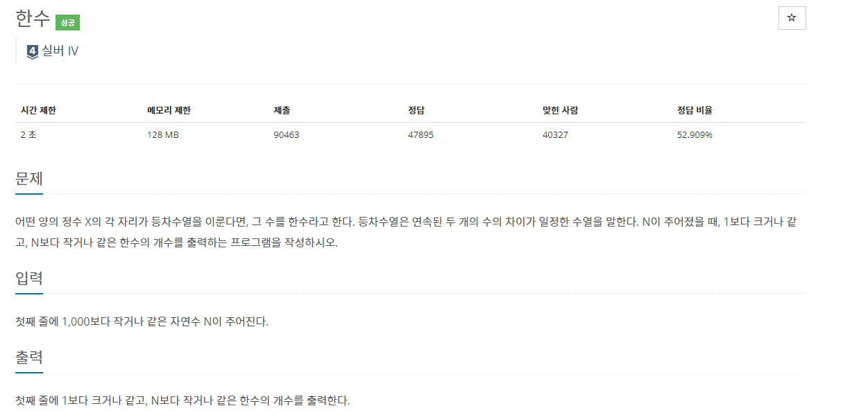 이 문제의 핵심은 해당 수가 '한수'인지, 아닌지를 구별하는 방법을 만들어내는 것이다. 우선 각 자리가 등차수열을 이루면 참이므로, 1~9, 10~99는 모두 한수가 될 수 밖에 없다. 따라서