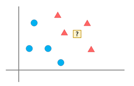 분류 알고리즘으로는 K-최근접 이웃(K-Nearest Neighbors) 알고리즘이 있습니다. 이는 위의 그림과 같이 새로운 데이터를 입력했을 때, 주위에 어떤 종류의 데이터들이 가까이에 있는지 여부에 따라 입력된 데이터를 분류해 주는 알고리즘입니다. 하지만 가장 유사한 데이터 하나만 놓고 판단하기에는 부적절한 경우가 발생할 것입니다. 따라서 입력된 데이터와 근접한 k개의 데이터를 놓고 비교하게 됩니다. 최선의 k값을 찾는 것은 어려운 문제이며, 일반적으로는 데이터 총 개수의 제곱근 값을 사용하고 있습니다.