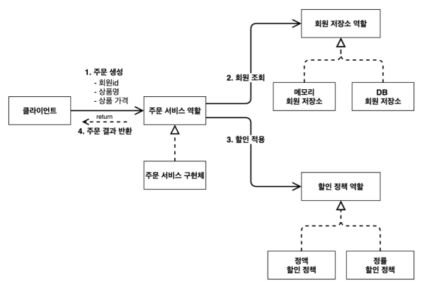 요구사항을 보면 회원 데이터를 저장하는 곳, 할인 정책 적용은 설계 단계에서 결정할 수 있는 부분이 아니다. 하지만, 정책이 결정되지 않아도 인터페이스를 만들고, 구현체를 갈아끼우는 방식을 사용하면 먼저 개발할 수 있다!