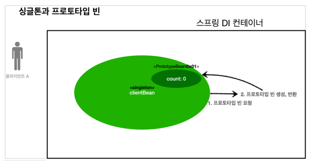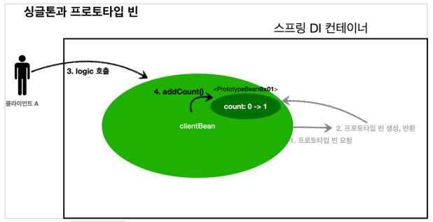 2) 스프링 컨테이너는 프로토타입 빈을 생성, clientBean에 넘겨준다. 이때 prototypeBean의 count 필드 값은 0이다.