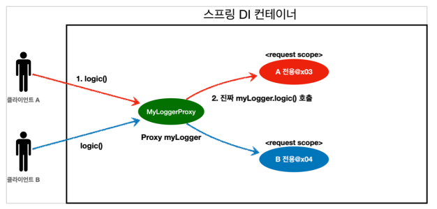 클라이언트가 myLogger.logic() 호출 -> 사실 가짜 프록시 객체의 메서드를 호출 -> 가짜 프록시 객체가 진짜 myLogger.logic()을 호출