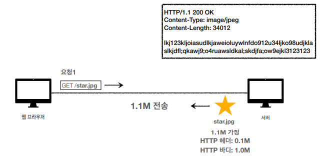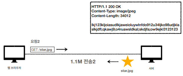 서버에서 star.jpg라는 이미지를 받기 위해 요청하고, 해당 이미지가 담긴 HTTP 메시지를 응답받는다.