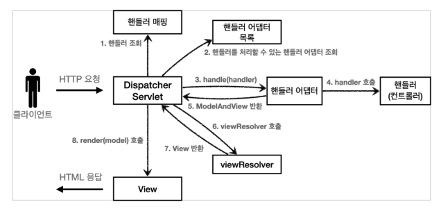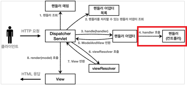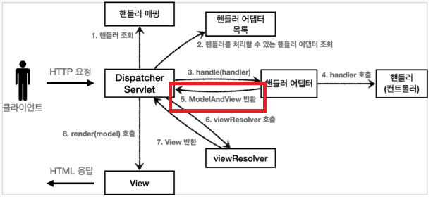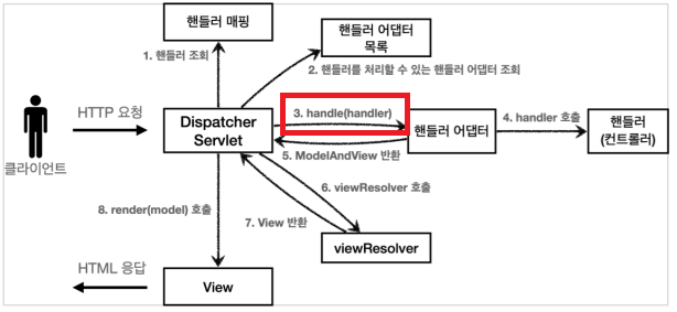 // 3. 핸들러 어댑터 실행 -> 4. 핸들러 어댑터를 통해 핸들러 실행 -> 5. ModelAndView 반환
