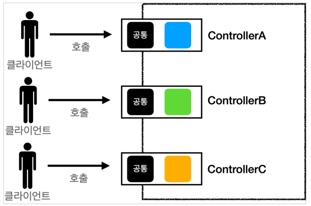 위 코드는 Front Controller가 적용되지 않았을 때 컨트롤러가 호출되는 형식이다. 모든 컨트롤러가 클라이언트의 요청을 받는데, 이때 공통되는 코드가 발생할 수 밖에 없다. (View로 이동, 한글 인코딩 등등...)