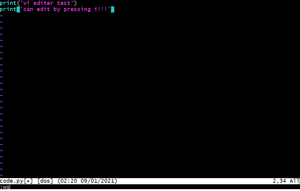 입력모드에 들어가서 원하는 코드를 모두 편집한 후, 다시 명령모드로 들어가고 싶은 경우에는 esc를 누르면 됩니다. 그 이후 vi편집기를 끄기 위한 명령어를 설명하겠습니다.