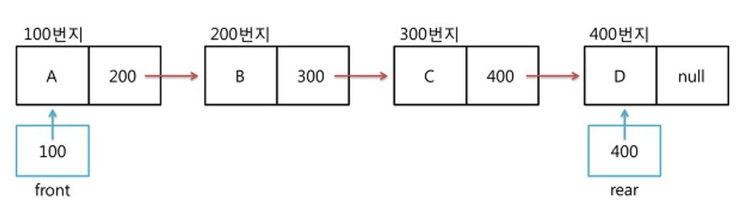 Linked list-base Queue(연결 리스트 기반 큐)는 이름 그대로, queue를 linked list에 저장하는 방법을 말합니다. Linked list는 tail에서의 삭제가 효율적이지 않기 때문에, 주로 head를 front, tail을 rear로 둔 후 사용하는 편입니다. Linked list로 queue를 구현할 시, 별도의 비어있는 메모리가 생기지 않는다는 것이 장점입니다.
