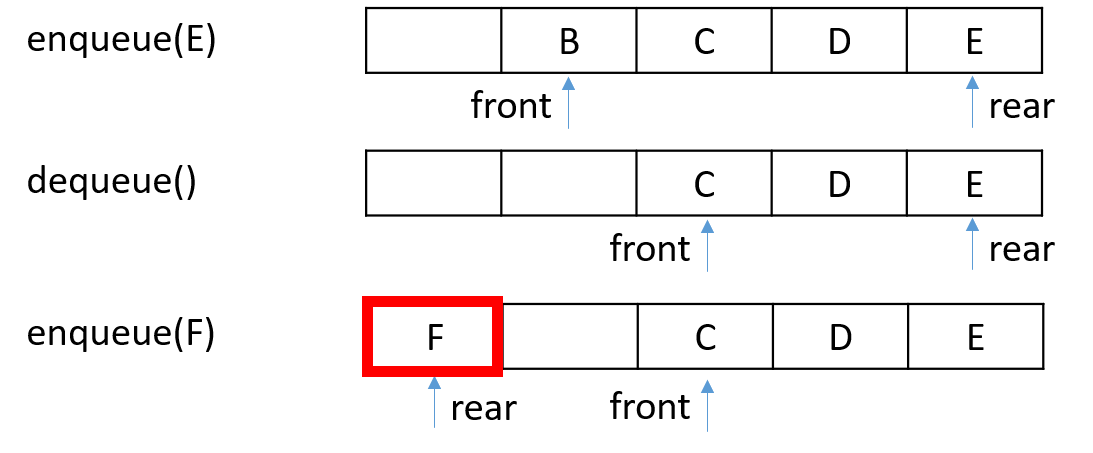 1번의 방식은 메모리 손실이 심하다는 단점이 있었습니다. 이러한 단점을 보완한 방식이 위의 그림과 같은 Array-base Circular Queue(배열 기반 원형 큐)입니다. 배열 기반 원형 큐의 특징은, rear가 배열의 마지막에 도달하였으며, front앞에 dequeue로 인해 삭제되어 비어있는 메모리가 남아있을 경우, 다시 배열의 앞으로 돌아와서 element를 삽입한다는 점입니다. 이는 마치 배열의 시작과 끝을 서로 연결한 원형과 같기 때문에, 이를 배열기반 원형 큐라고 부릅니다.