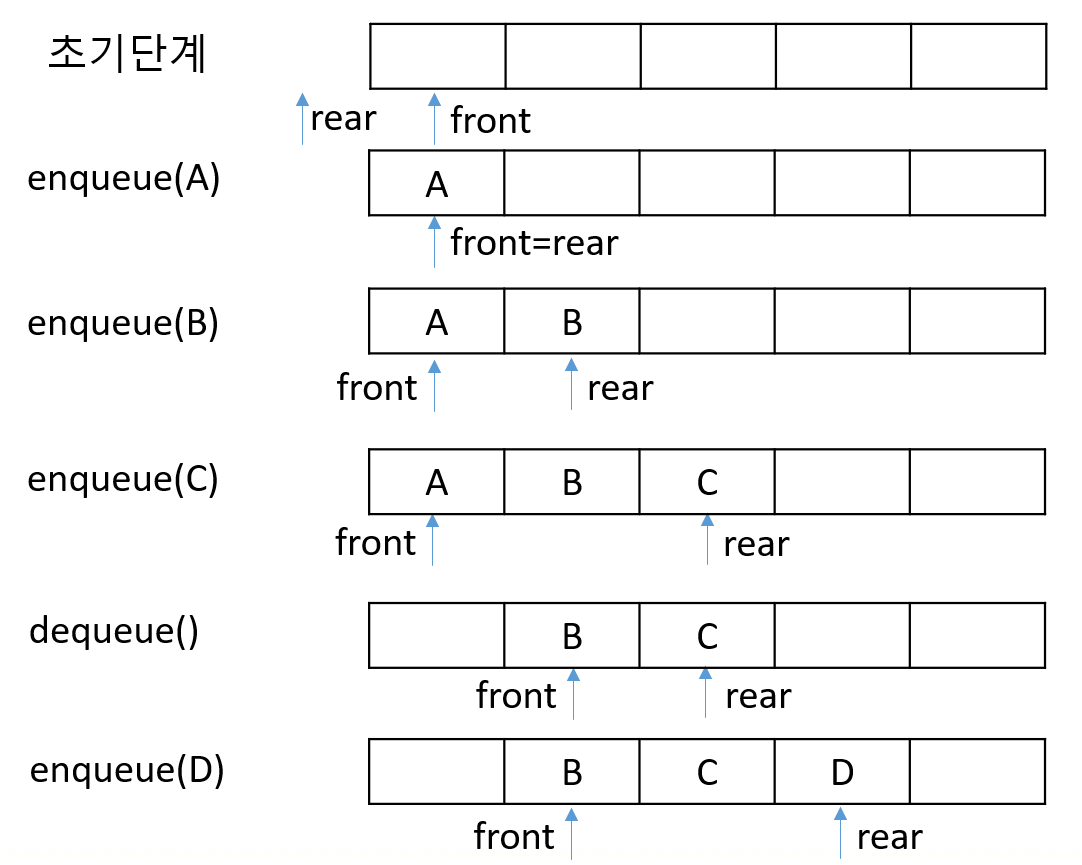 Array-base Queue(배열 기반 큐)는 제목과 같이, queue를 array에 저장하는 방식을 말합니다. 위의 그림과 같이 배열의 앞부분을 front, 뒷부분을 rear로 놓고 사용합니다. 일반 배열 기반 큐의 특징은 값을 계속 enqueue할 경우, 앞의 메모리 공간이 비어있는 상태로 방치된다는 단점이 있습니다. 물론 파이썬을 기반으로 구현하면 그렇지 않지만, c++, java 등 array를 선언할 시 배열의 크기가 정해지는 경우, 이는 심각한 메모리 손실로 이어집니다.