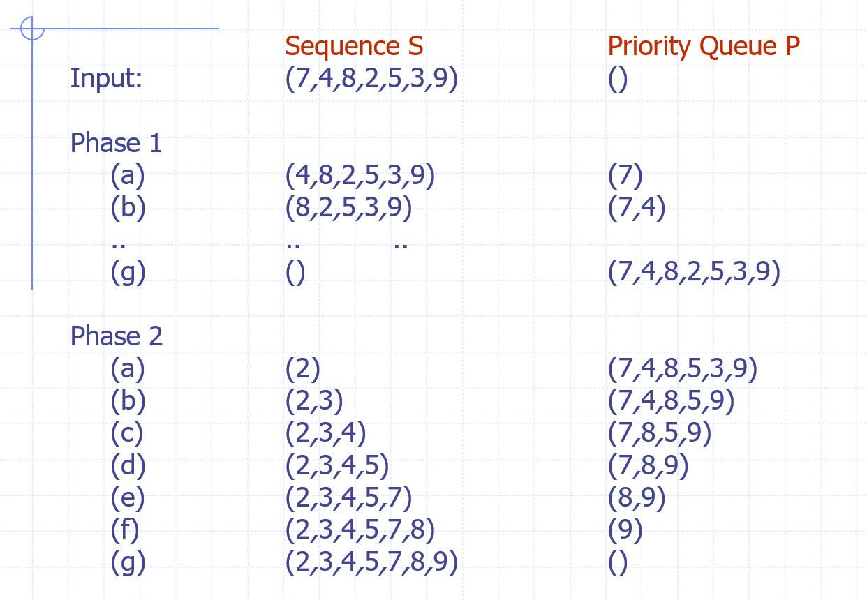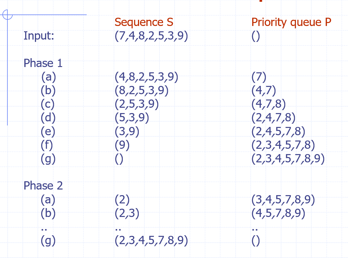 2) sequence P에서 removeMin을 전체 값들의 개수 n만큼 반복하고, 이 값들을 순서대로 기존의 sequence에 옮긴다.