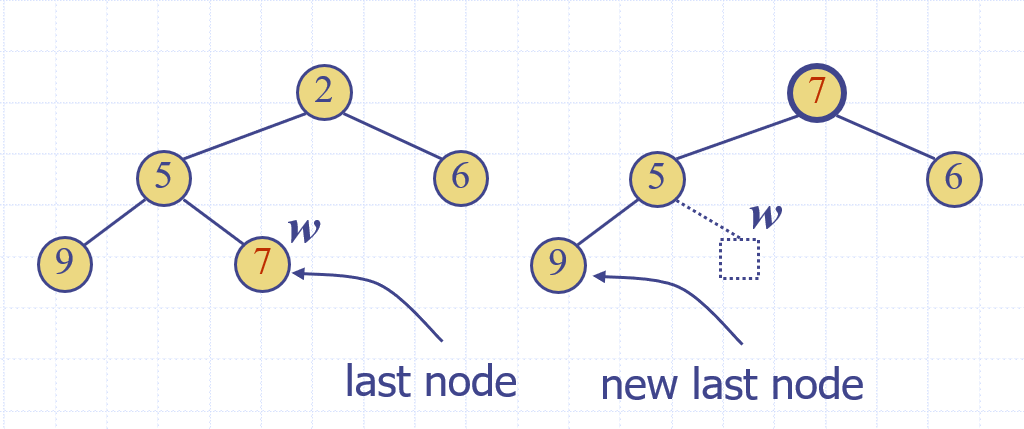 1) 마지막 node의 데이터 값을 root의 데이터 값에 덮는다.