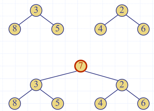 2) 1개의 key값을 root로 하고, 나머지 두개의 heap이 subtree가 되는 새로운 node를 만든다