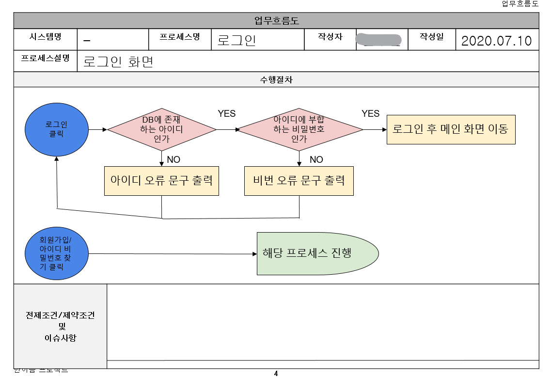 한이음 멘토링을 진행하면서 인상깊었던 것 중 하나는 실무에서 작성되는 문서들을 직접 작성해 보았다는 점이다. 물론 이번 프로젝트에서는 특정 고객 혹은 기획자가 없기 때문에, 팀원들 끼리 고객과 기획자가 되어 문서를 작성하는 형식으로 진행했다. 첫 미팅 후 작성했던 요구사항정의서에 이어서, 기능차트, 업무흐름도, 테이블정의서와 같은 서류들을 작성하였다.