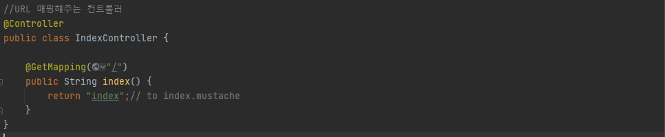 이때 컨트롤러에서 "index" 문자열을 반환하기만 해도 build.gradle에 추가한 머스테치 스타터 덕분에 앞에 "src/main/resources/templates", 뒤에 ".mustache"가 붙는다. 결국 src/main/resources/templates/index.mustache 으로 변환되어 View Resolver(URL 요청의 결과를 전달하는 타입과 값을 지정하는 관리자라고 생각하면 됨)