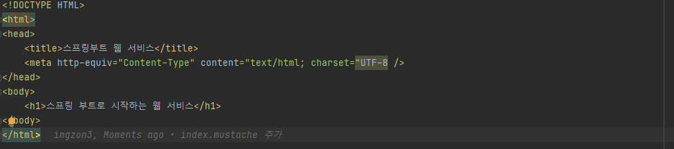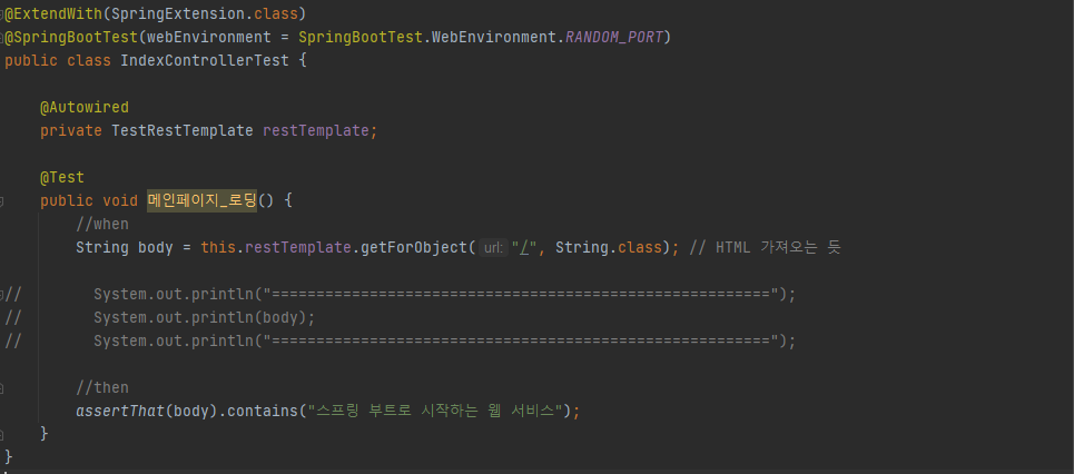 웹페이지가 정상적으로 작동하는지 확인하기 위해서는 "/"로 호출했을 때 index.mustache에 포함된 코드들이 있는지 확인하면 된다. 굳이 전체 코드를 지니고 있는지 확인할 필요는 없으므로, "스프링 부트로 시작하는 웹 서비스" 문자열을 포함하고 있는지만 확인해본다.